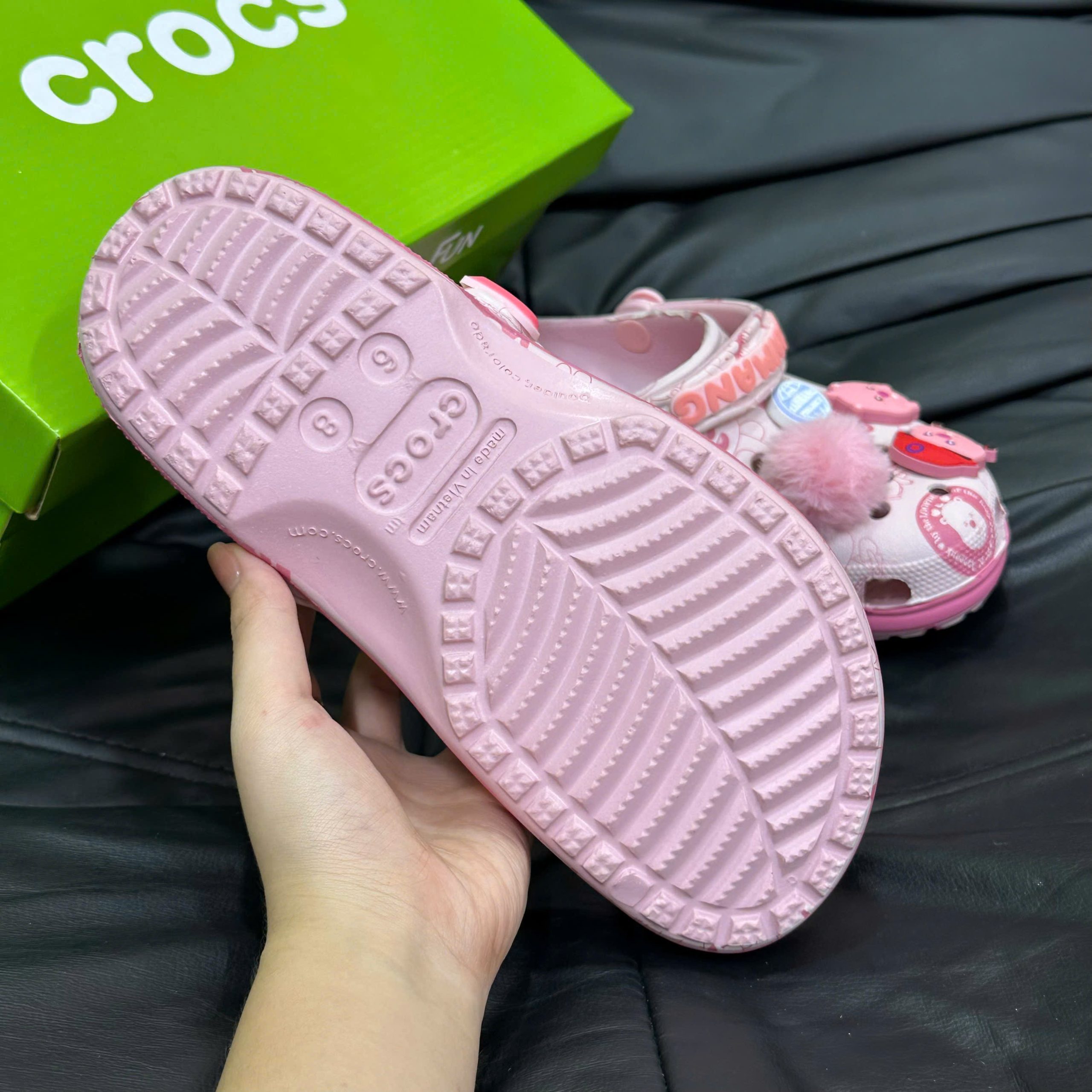 Crocs Loppy Hồng Bản Chuẩn mang đến vẻ ngoài dễ thương, tươi sáng với tông màu hồng pastel cực kỳ bắt mắt. Thiết kế Loppy đặc trưng với form tròn, mềm và những chi tiết tạo hình ngộ nghĩnh giúp đôi dép trở thành lựa chọn hoàn hảo cho những ai yêu thích sự đáng yêu nhưng vẫn muốn sự thoải mái ở mức cao nhất. Chất liệu Croslite chính hãng giúp đôi dép nhẹ, thoáng và êm, phù hợp để mang suốt cả ngày mà không gây khó chịu.